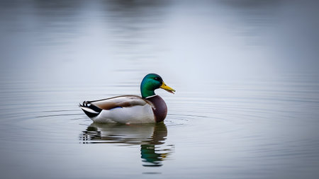 Mallard duck swimming gracefully in a tranquil lake under soft morning light