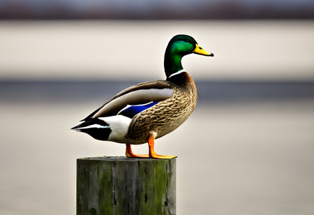 A male mallard duck stands elegantly on a rock by a flowing river. The peaceful scene captures the beauty of nature and wildlife in a calm setting.