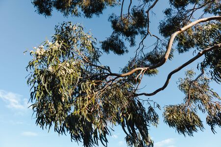 Close up of soap mallee (Eucalyptus diversifolia) plant, blue sky in the background; the Eucalyptus tree is native in Australia and invasive in other parts of the world, such as the United States