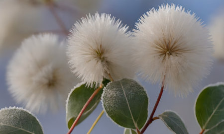 Delicate eucalyptus leaves sway gently while vibrant blossoms showcase nature beauty beneath the sunny sky.