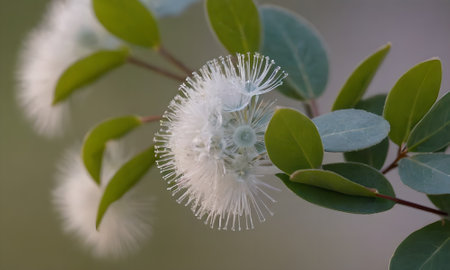 Eucalyptus shrubs with flowers. Beautiful flower and plants. Close up detail of eucalyptus blossoming. Wild flowering plant with pulp.