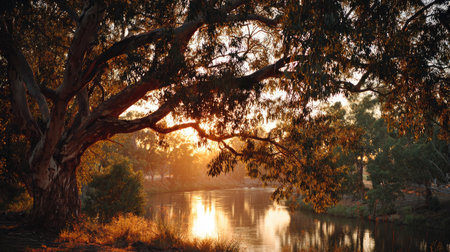 The River red gum at sunset, Golden red sunset light filters through the leaves, still atmosphere, warm orange glow blending with natural green tones.