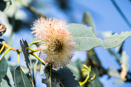 Young Soap mallee (Eucalyptus diversifolia) flowers on a blue sky background, California