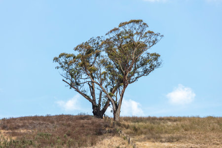 Iconic Australian landscape with large eucalyptus gum tree in country setting.