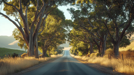 Sun rays on a road through a forest. Bright rays of sunlight on the forest road. magical shaped trees from Australia.