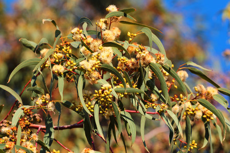 Yellow flowers and gray leaves of eucalyptus kruseana on a sunny day