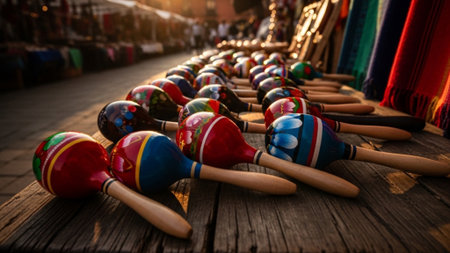 A cinematic wide-angle, environmental shot of colorful, hand-painted maracas displayed on a rustic w