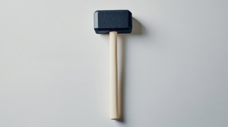 A black rubber mallet with a wooden handle rests against a light background, showcasing its minimalistic design and practical use in various tasks.