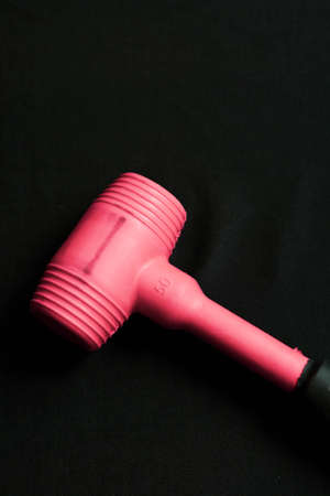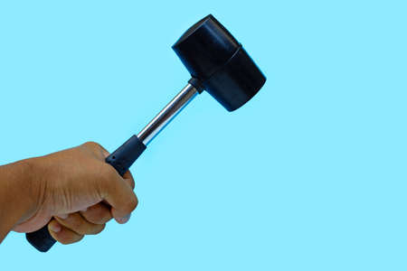 The hand holds a rubber mallet with a wooden handle lose up Isolated on a black background