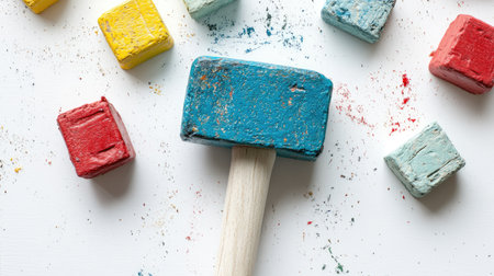 A vibrant blue mallet surrounded by colorful blocks on a white surface, ideal for illustrating creativity, crafting, and artistic expression in various projects.