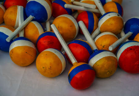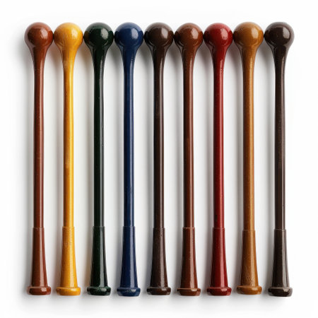 A collection of traditional Indonesian gamelan mallets, known as 'tabuh,' are arranged on a dark wooden table. The mallets feature intricately carved wooden handles and colorful, fabric-covered heads, showcasing traditional craftsmanship and musical culture.