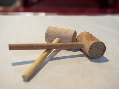 Rubber hammer and chisel Placed on a wooden table What types of Different patterns of use.