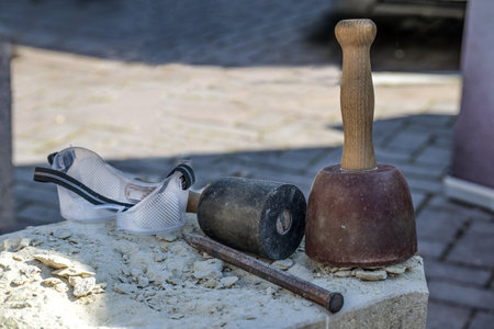 Tools from a stonemason, consisting of plastic coated wooden mallets, chisel and safety goggles on a gray stone, traditional craft occupation, copy space, selected focus, narrow depth of field