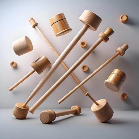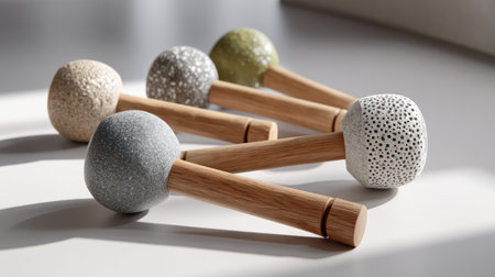 A captivating arrangement of decorative objects showcasing varied textures and natural wood handles, perfect for enhancing modern interior aesthetics and warmth.
