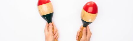 Cropped view of woman holding maracas on white background, panoramic shot