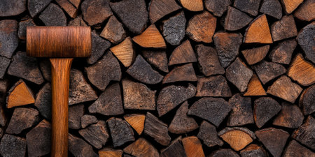 Close-up of a wooden mallet resting against a backdrop of neatly stacked firewood, showcasing rich textures and warm earthy tones ideal for rustic-themed projects.