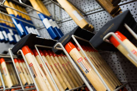 Set of different purpose hammers and tools hanged on wall against plastic window in craftsman carpentry workshop. DIY concept.