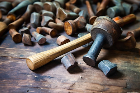 Close up of a group of hammers in the workshop of a jeweler.