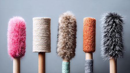 A stunning arrangement of colorful wooden handled tools on a soft gray background enhances creativity. Perfect for designers and craftsmen seeking inspiration.