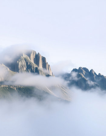 Landscape of Dolomites mountains in Italy with clouds and fog