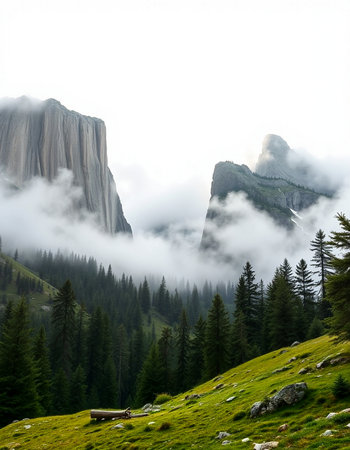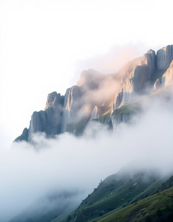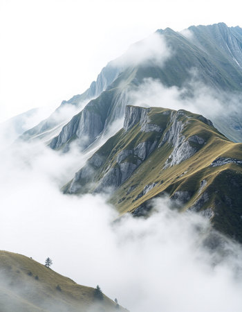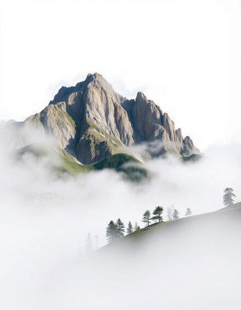Misty mountains shrouded in fog, creating a serene and mysterious atmosphere.