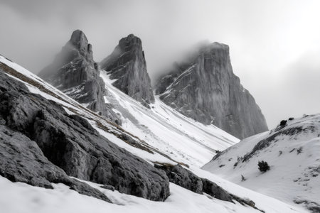 Dolomites mountain range covered with snow and fog during winter, rendered in black and white