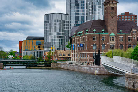 MALMO, SWEDEN, APRIL 25, 2019: View of waterfront alongside a channel in Malmo, Sweden