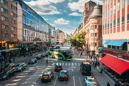Stockholm, Sweden. Red Hop On Hop Off Touristic Bus For Sightseeing Riding Down The Vasagatan Street. City Tour Bus.