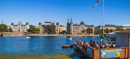 Copenhagen, Denmark - August 7, 2018: Tourists visiting and enjoying views of Queen Louise's Bridge and Peblinge Lake in central Copenhagen from Kaffesalonen outdoor cafe