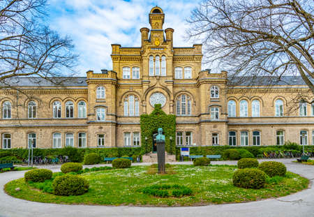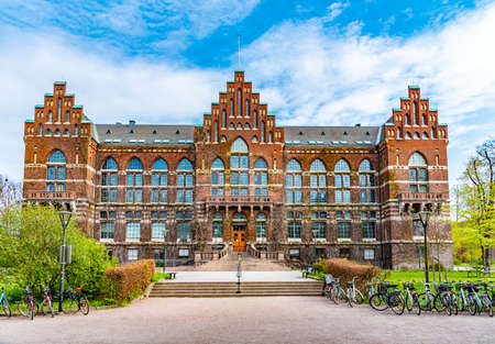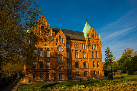 LUND, SWEDEN - APRIL 4, 2012: Facade front view of the old famous University Library made of red bricks in the city park of Lund Sweden April 4, 2012.