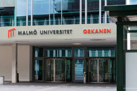 Malmö, Sweden - May 17, 2020: The entrance to the Malmö University building Orkanen
