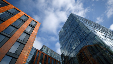 STOCKHOLM, SWEDEN - SEPTEMBER 13, 2018: Modern office glass architecture in central Stockholm on September 13, 2018 in Stockholm, Sweden.