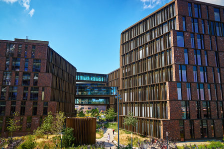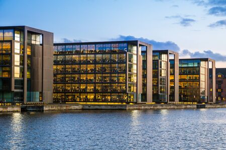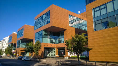 Residential district in Copenhagen, Denmark. Modern city architecture with eco friendly buildings. Urban setting with contemporary office buildings and walking people