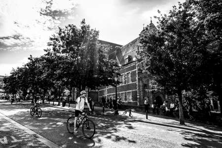 Brussels, Belgium - September 22, 2019: People on bicycles or walking on the streets in the city center on a sunny autumn day. Monochrome
