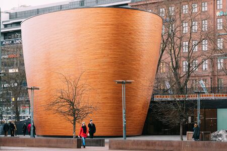 Helsinki, Finland - December 7, 2016: People Walking Near Kamppi Chapel Also Known As Chapel Of Silence Located On Narinkka Square. Chapel Is Operated By Helsinki Parish Union And Social Services Department Of Helsinki