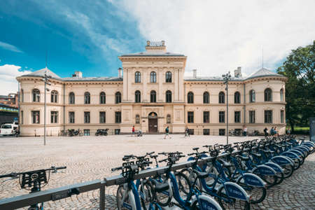Oslo, Norway - June 24, 2019: Row Of City Parked Bicycles Bikes For Rent Near NGO's old building. Now it is used today by the Academy of Fine Arts.