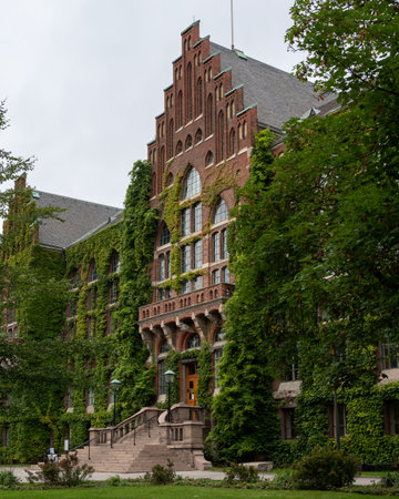 The red brick exterior facade covered in green ivy of the university library in Lund Sweden