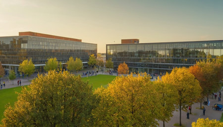 Group of students walking outdoors on a university campus during late afternoon sunlight, surrounded by trees and modern buildings