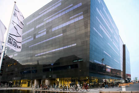 COPENHAGEN, DENMARK - APRIL 30, 2020: Exterior of Black Diamond Royal Library with urban street and cloudy sky at background, Copenhagen, Denmark