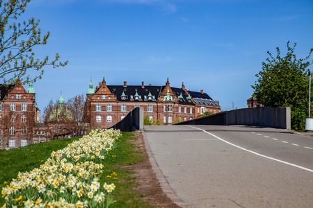 empty road and bridge, beautiful blooming daffodils and historical architecture in copenhagen, denmark