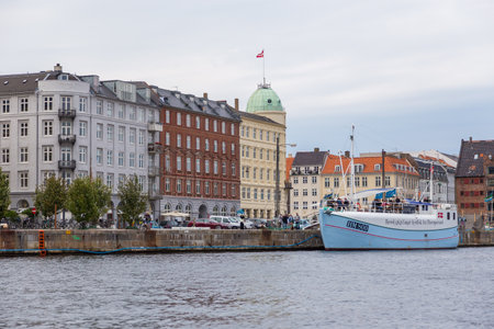 Copenhagen, Denmark- 29 August 2014: View of the harbor in Copenhagen. Boats moored in the port on the channel in the city center.
