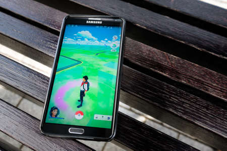 Moscow - August 6, 2016: Samsung Galaxy smartphone with a running Pokemon Go application