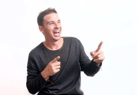 portrait of a stylish man on a white background. isolate having fun fooling around laughing