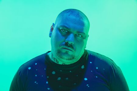 Portrait of a guy with colorful neon light on green studio background. Male model with calm, serious mood. Facial expression, cyberpunk, millenials lifestyle and look like. Future, technologies.