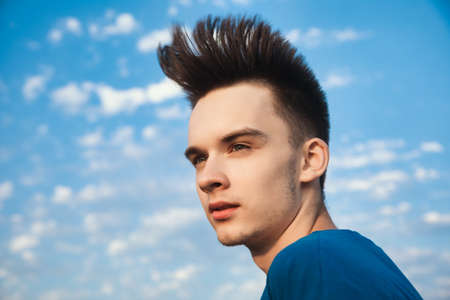 Outdoor portrait of teenager boy looking away with hair blowing in the wind against evening sky