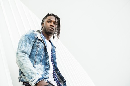 Portrait of an attractive African-American young man dressed casual and modern on city street