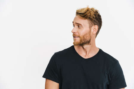 Handsome caucasian blonde man posing and looking aside isolated over white background