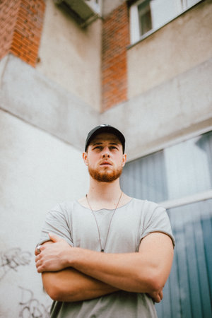 Young handsome man in baseball cap and black t-shirt posing in an urban context