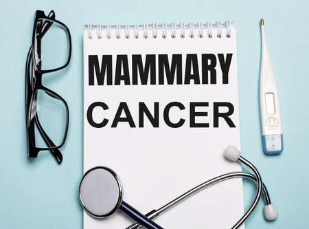 MAMMARY CANCER written on a white notepad next to a stethoscope, goggles, and an electronic thermometer on a light blue background. Medical concept.