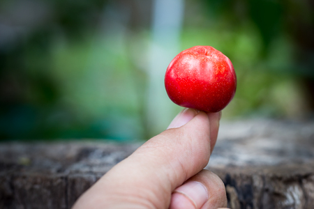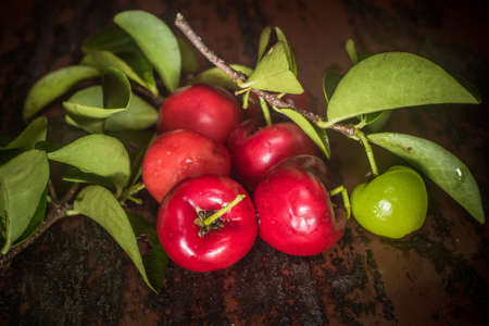 Acerola cherry of thailand on wood. Select focus, Barbados cherry, Malpighia emarginata, high vitamin . Acerola fruit.